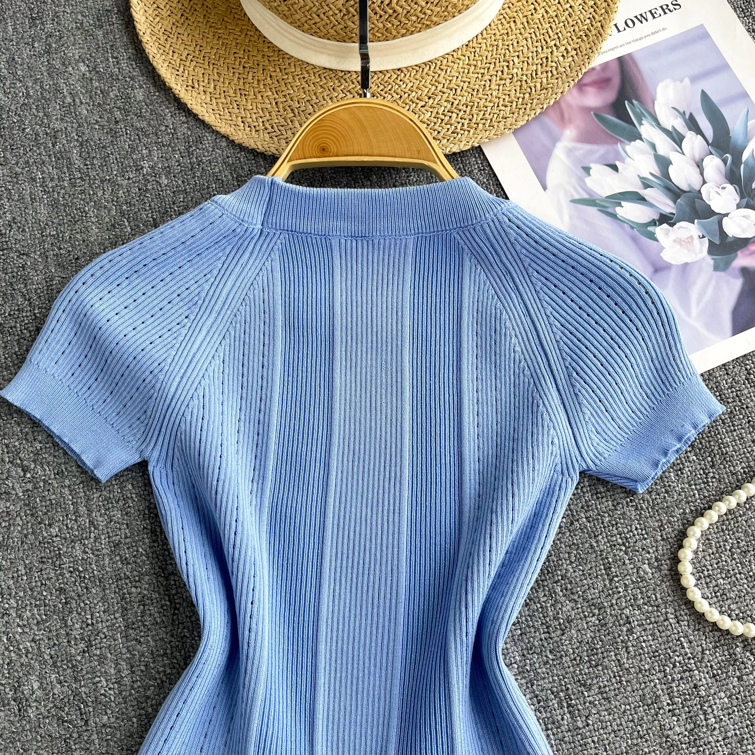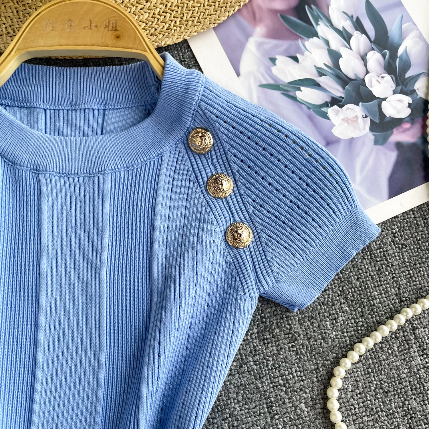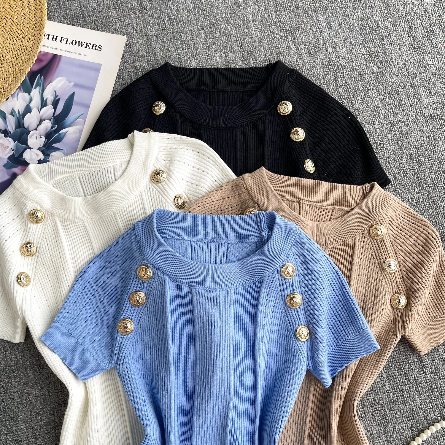 This knitted top is both casual and stylish. The gold button design makes it unique, and the elastic fit provides perfect comfort and style. With short sleeves and an O-neck, it has a chic look that's ideal for daily wear or streetwear.